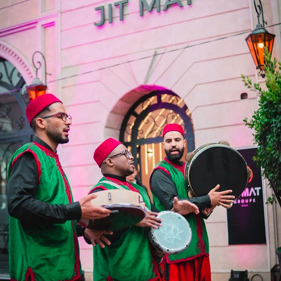 High-impact drumming and chanting to welcome guests or kick off the party with authentic Marrakchi fire.